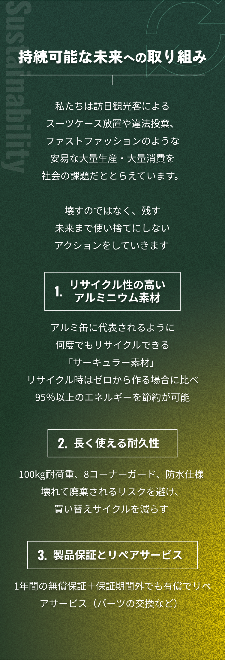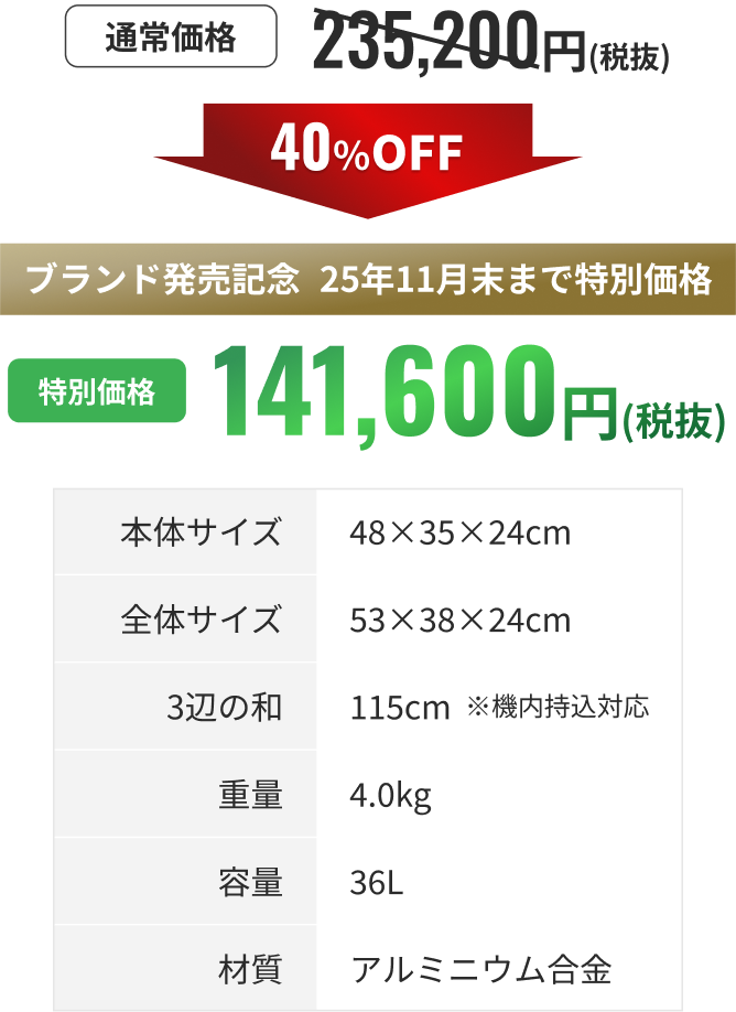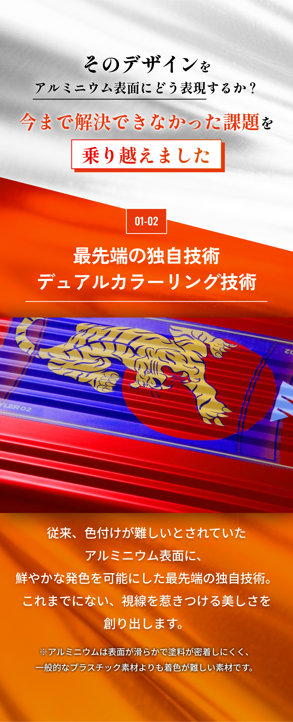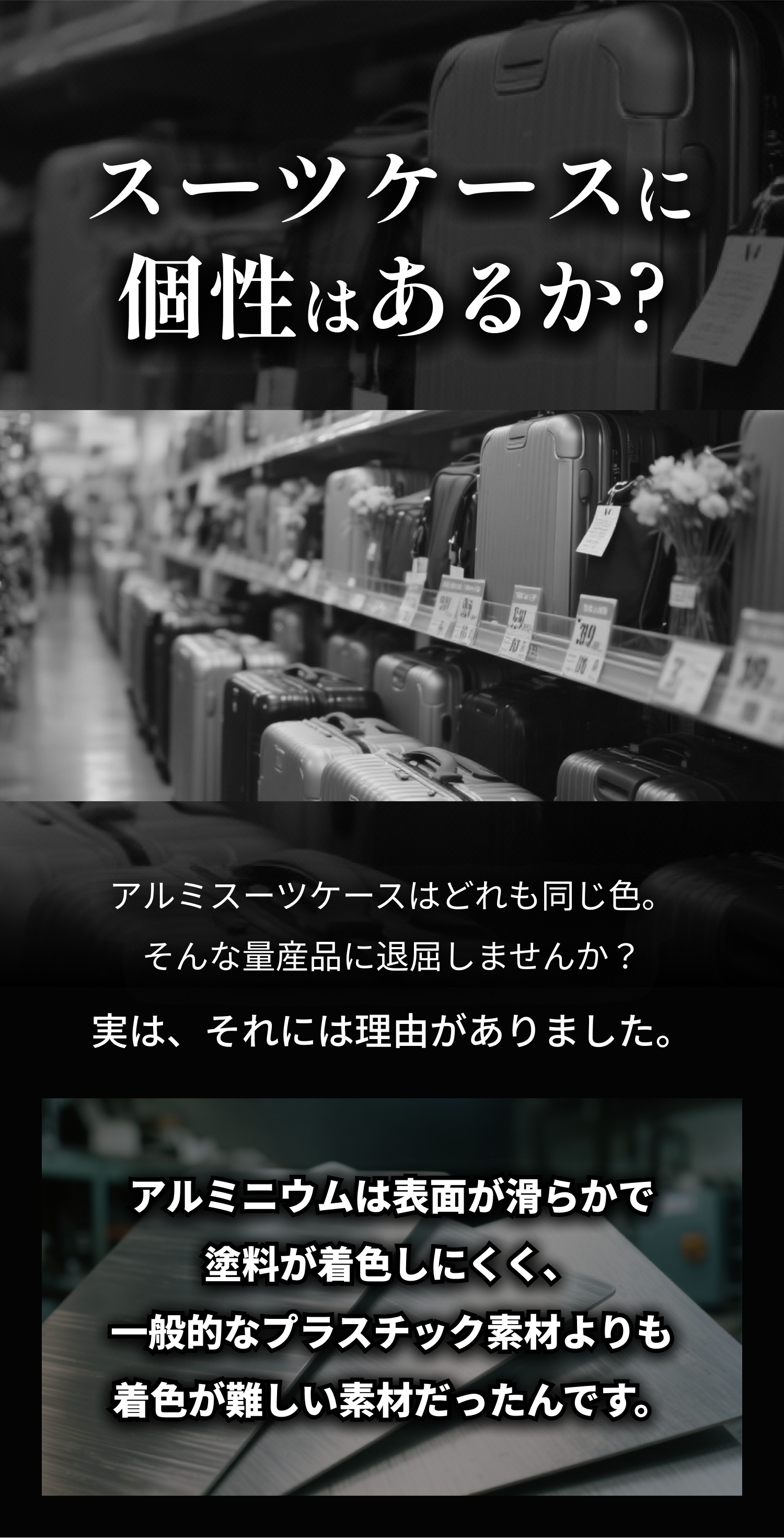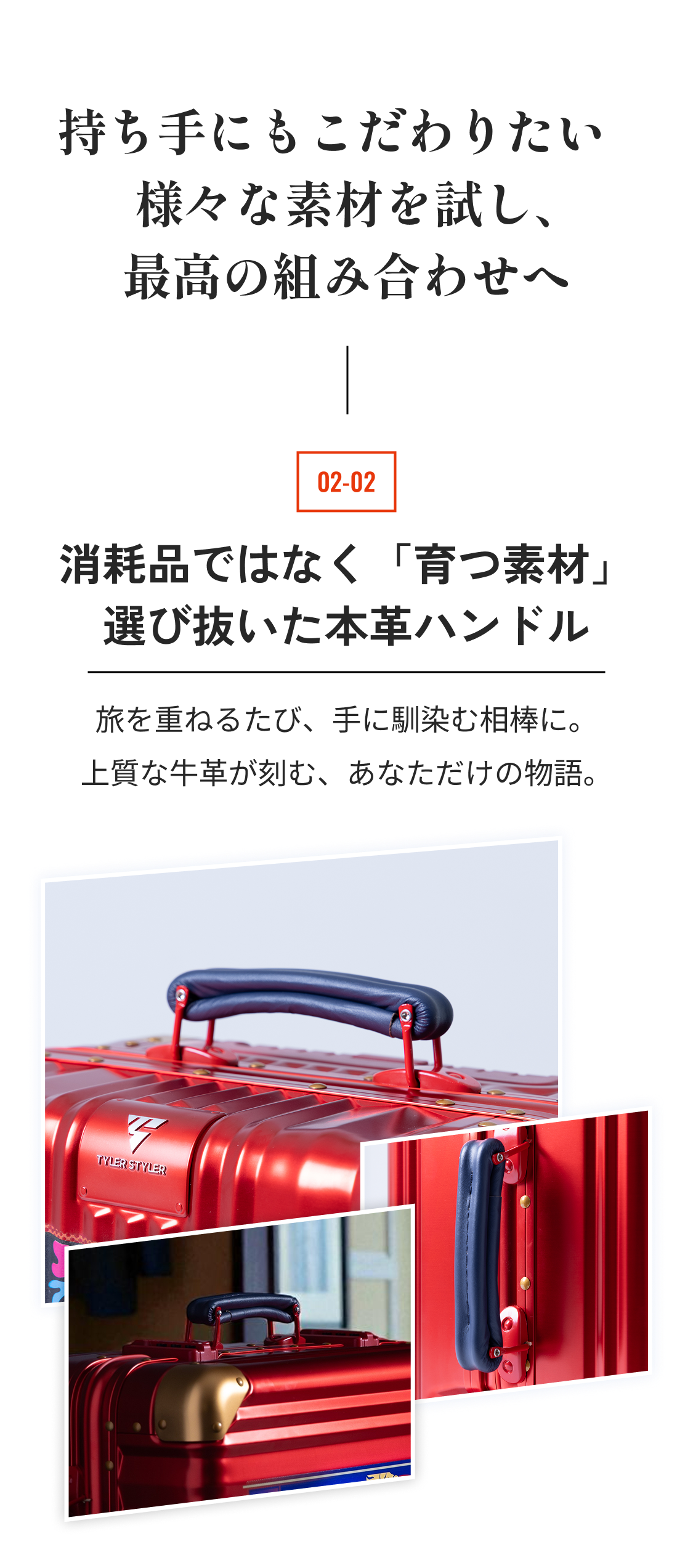 ※アルミ素材は、その性質上、小さな擦り傷や打痕が発生しやすくなっております。これらはご使用に伴う自然な変化であり、素材の個性としてお楽しみいただければ幸いです。なお、傷やへこみに関しては保証の対象外となりますので、予めご了承ください。